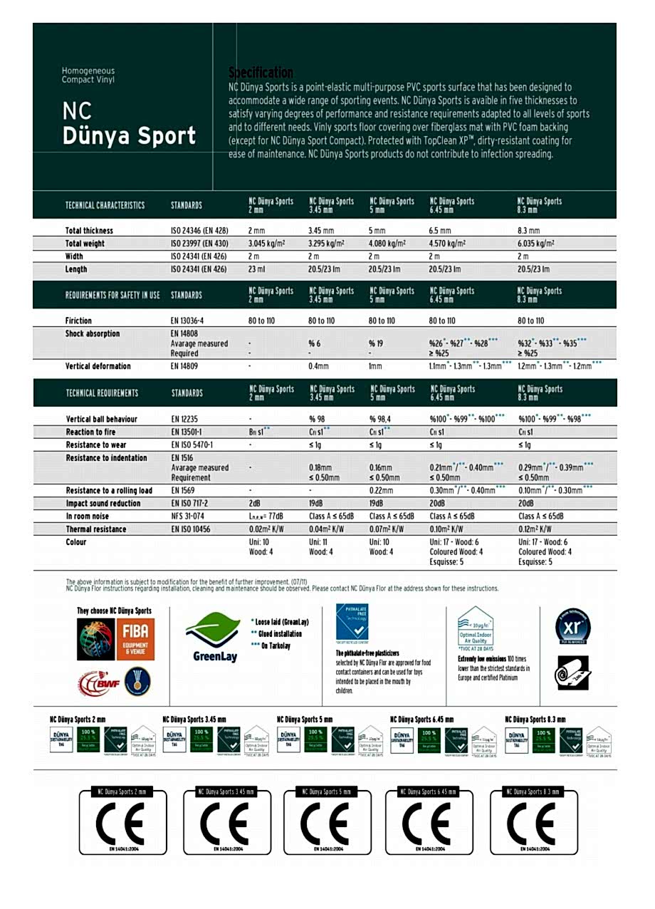 Ürünün çevre dostu özellikleri, Avrupa'daki en katı standartlardan daha düşük VOC emisyonları ile Platinum sertifikasına sahip olması ve phthalate içermemesi ile öne çıkar. Bu da NC Dünya Sport'u çocuklar da dahil olmak üzere herkes için güvenli ve sağlıklı bir zemin kaplama seçeneği yapar.